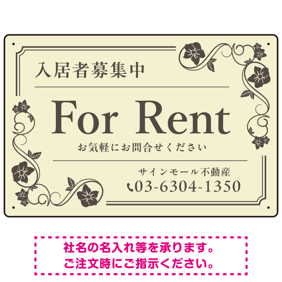 高級感漂う花柄モチーフ装飾 FOR RENT 入居者募集中 不動産向けデザインプレート看板 アイボリー W450×H300 エコユニボード(SP-SMD716B-45x30U)