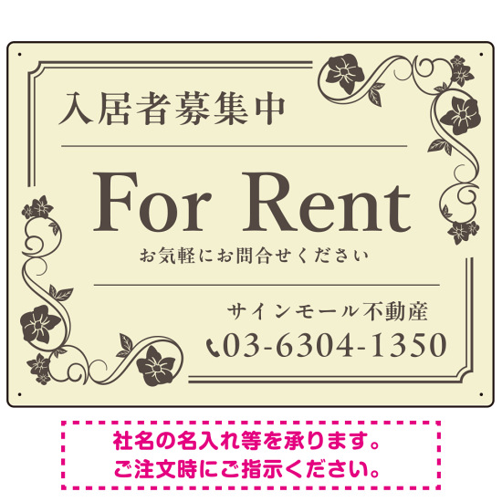 高級感漂う花柄モチーフ装飾 FOR RENT 入居者募集中 不動産向けデザインプレート看板 アイボリー W600×H450 エコユニボード(SP-SMD716B-60x45U)
