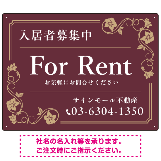 高級感漂う花柄モチーフ装飾 FOR RENT 入居者募集中 不動産向けデザインプレート看板 ブラウン W600×H450 エコユニボード(SP-SMD716C-60x45U)