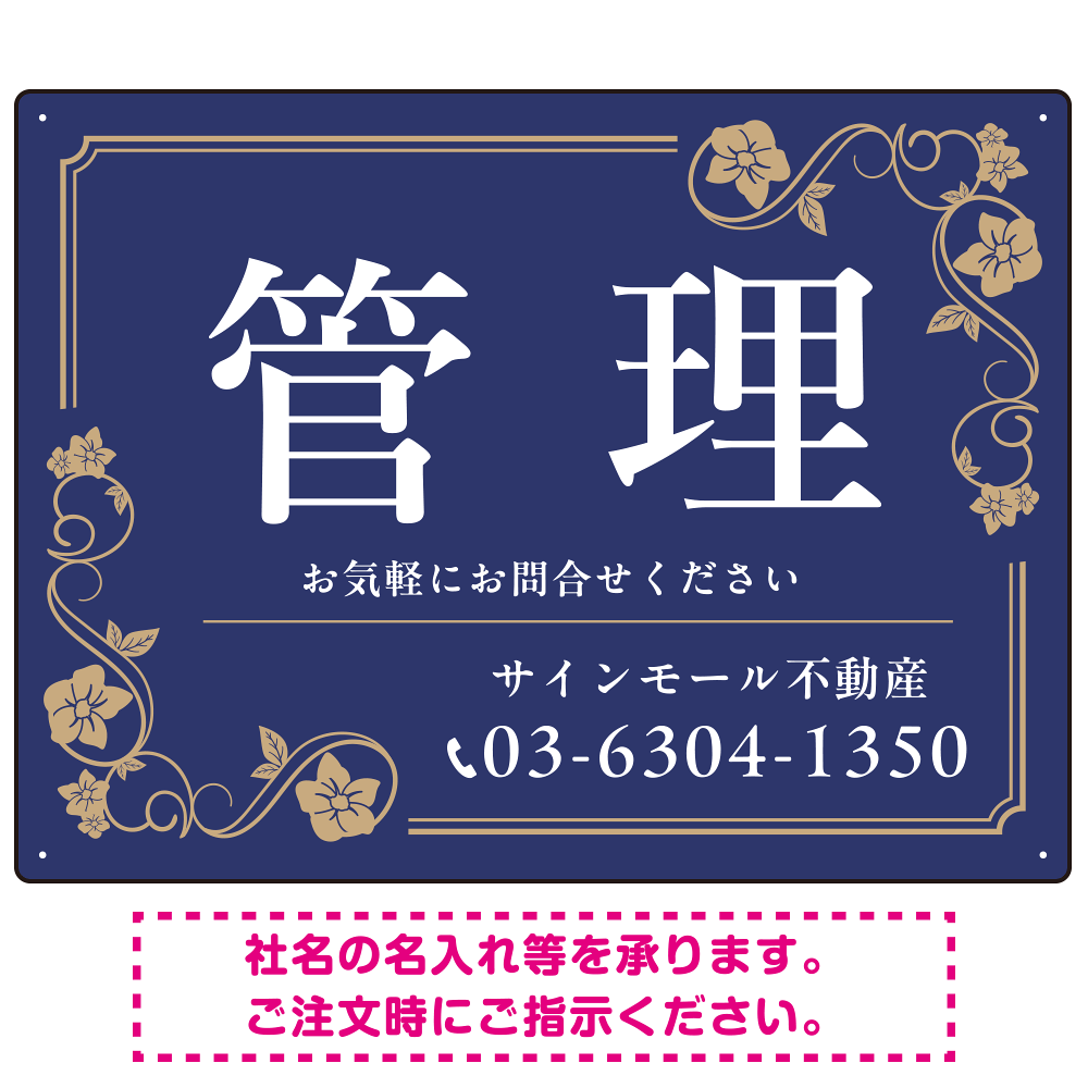 高級感漂う花柄モチーフ装飾 管理 不動産向けデザインプレート看板 ネイビー W600×H450 エコユニボード(SP-SMD717A-60x45U)