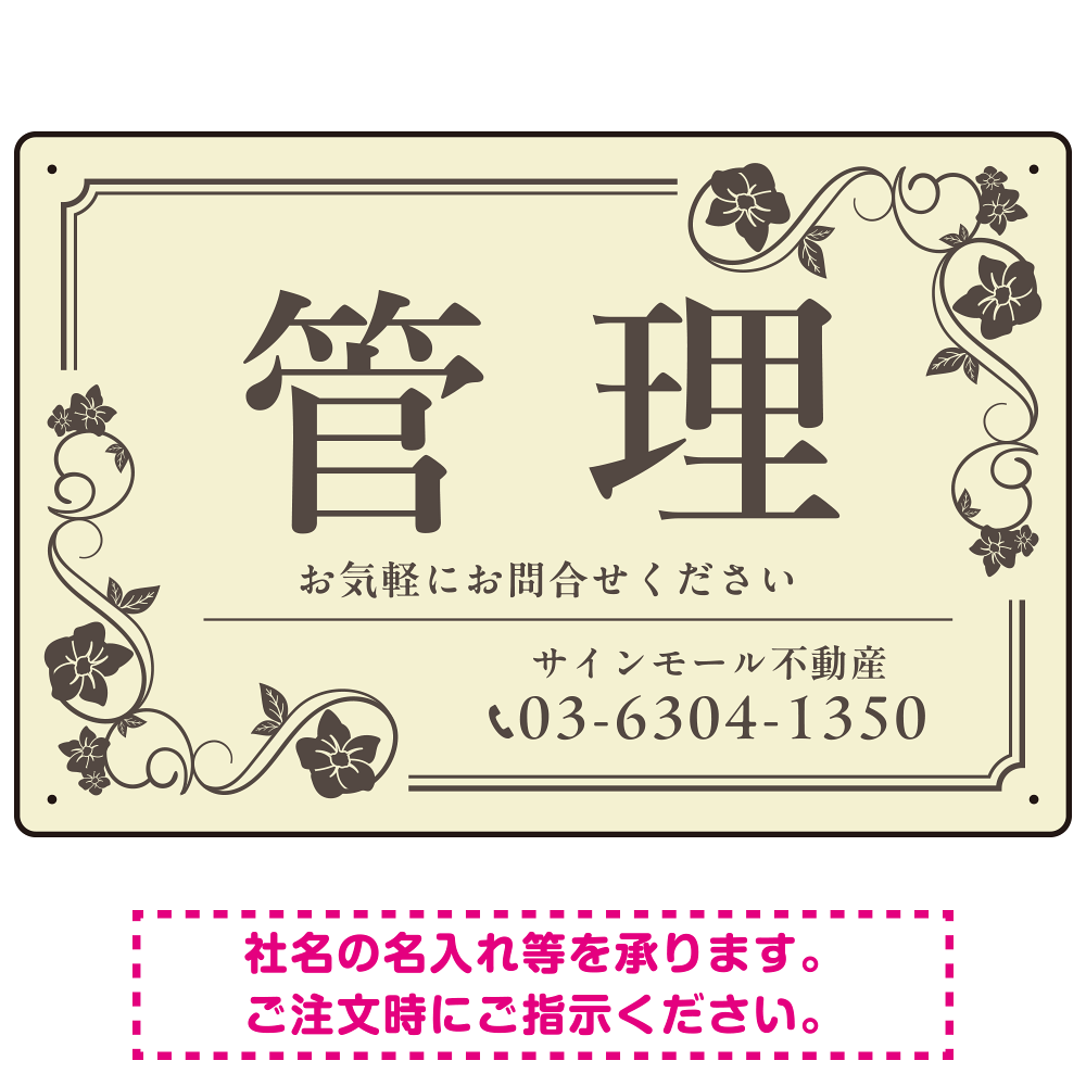 商品説明:高級感漂う花柄モチーフ装飾 管理 不動産向けデザインプレート看板 アイボリー W450×H300 エコユニボード(SP-SMD717B-45x30U)