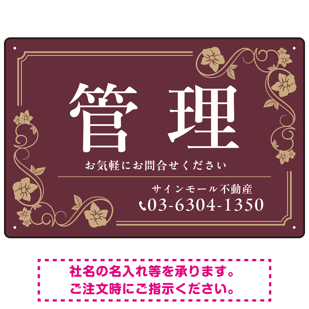 高級感漂う花柄モチーフ装飾 管理 不動産向けデザインプレート看板 ブラウン W450×H300 エコユニボード(SP-SMD717C-45x30U)