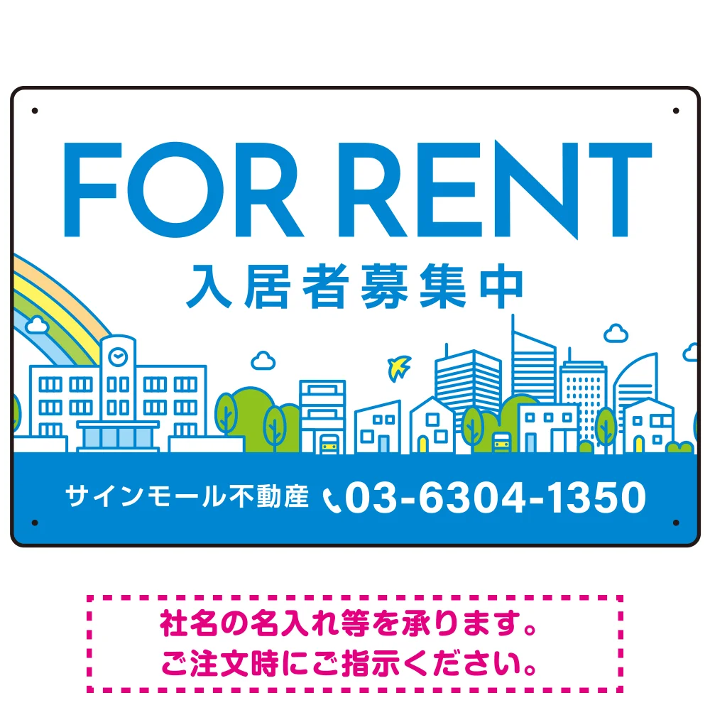 - カラフルな街並みが映える明るいデザイン FOR RENT 入居者募集中 不動産向けデザインプレート看板 ブルー W450×H300 アルミ複合板(SP-SMD718A-45x30A)
