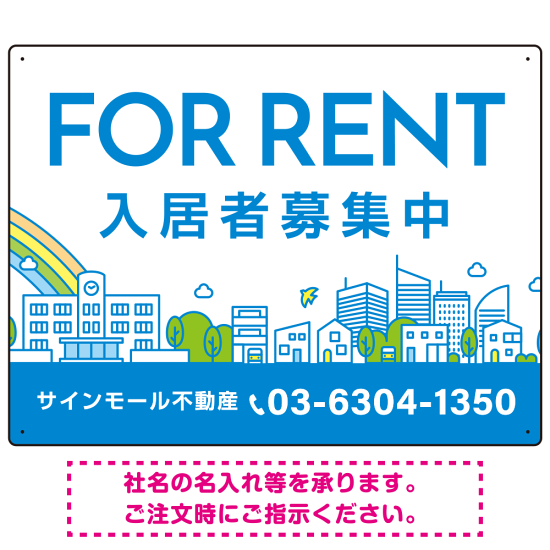 カラフルな街並みが映える明るいデザイン FOR RENT 入居者募集中 不動産向けデザインプレート看板 ブルー W600×H450 エコユニボード(SP-SMD718A-60x45U)