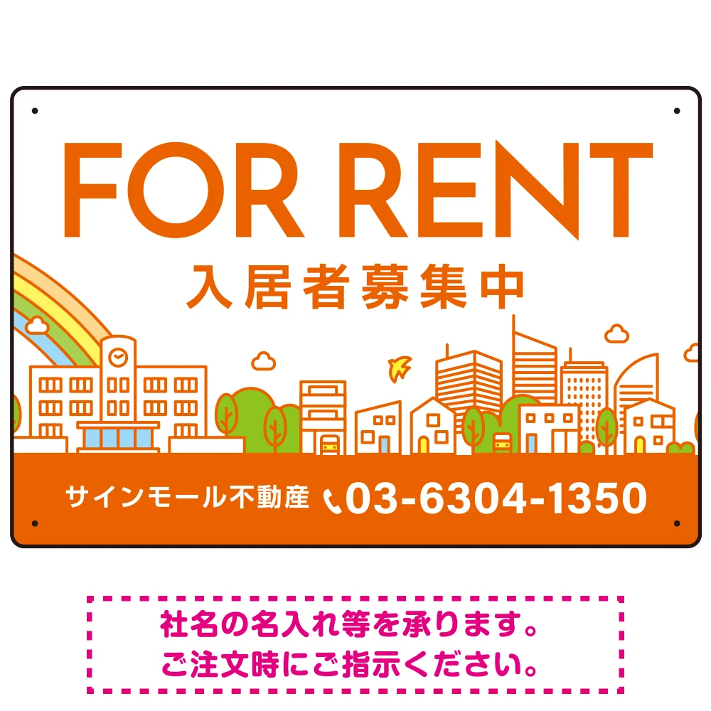 カラフルな街並みが映える明るいデザイン FOR RENT 入居者募集中 不動産向けデザインプレート看板 オレンジ色 W450×H300 エコユニボード(SP-SMD718C-45x30U) の商品詳細