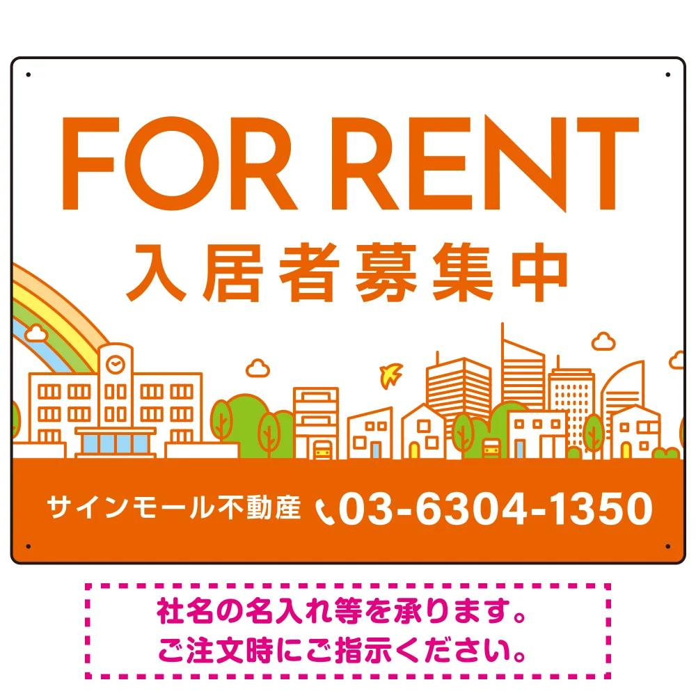 カラフルな街並みが映える明るいデザイン FOR RENT 入居者募集中 不動産向けデザインプレート看板 オレンジ色 W600×H450 アルミ複合板(SP-SMD718C-60x45A) の商品詳細