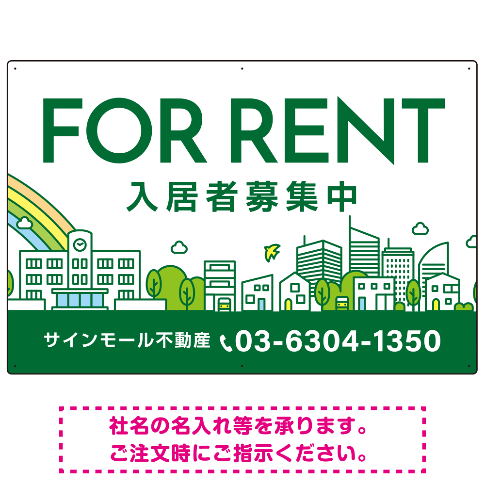 カラフルな街並みが映える明るいデザイン FOR RENT 入居者募集中 不動産向けデザインプレート看板 グリーン W900×H600 アルミ複合板(SP-SMD718D-90x60A)