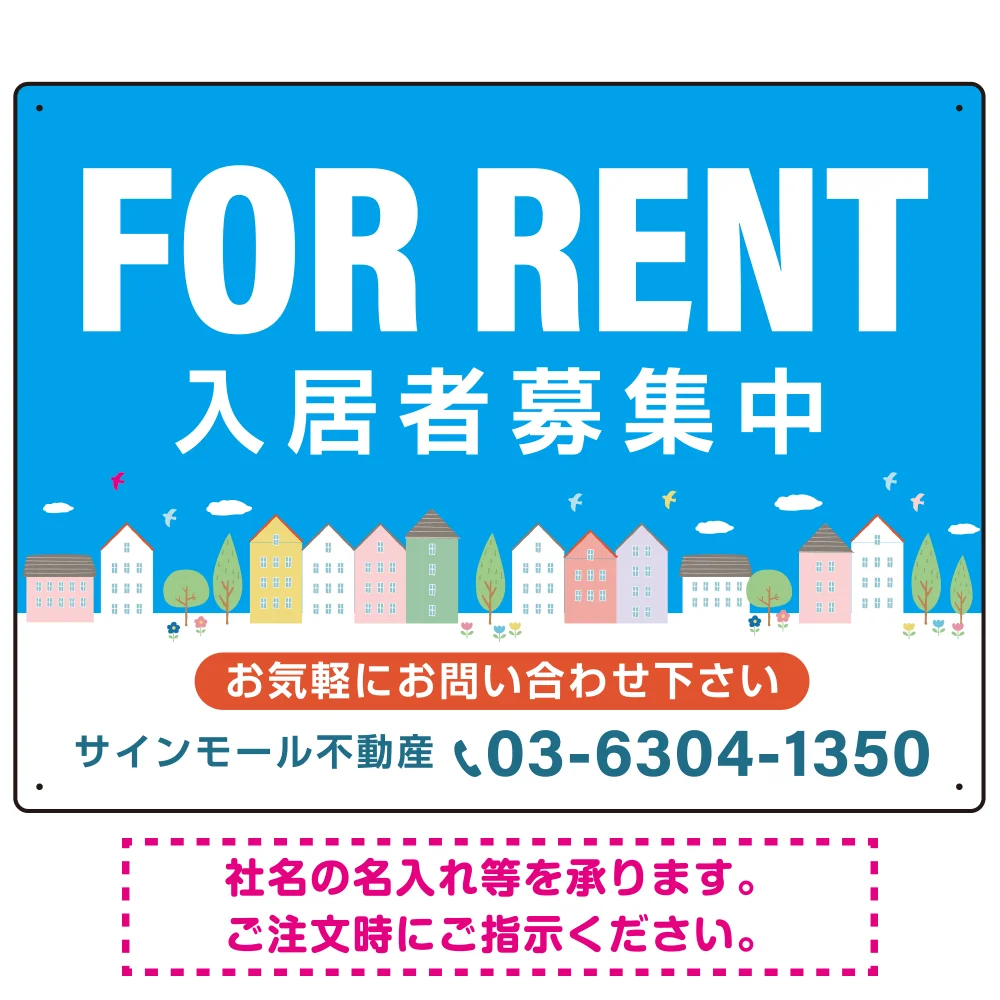 - 空と街並みの鮮やかなブルーデザイン FOR RENT 入居者募集中 不動産向けデザインプレート看板