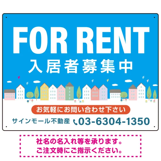 よくある質問:空と街並みの鮮やかなブルーデザイン FOR RENT 入居者募集中 不動産向けデザインプレート看板 W600×H450 アルミ複合板(SP-SMD720-60x45A)