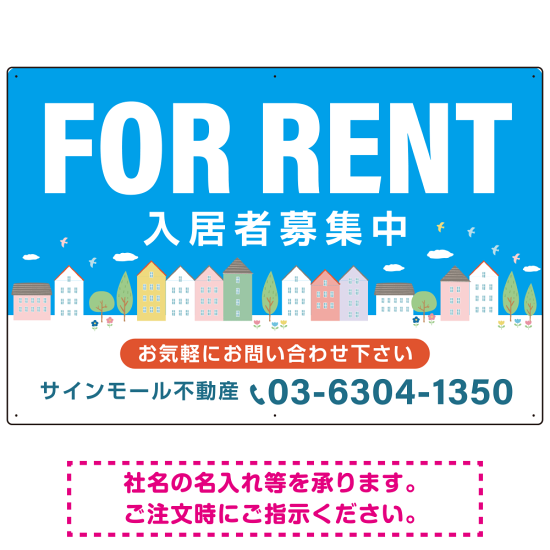 商品説明:空と街並みの鮮やかなブルーデザイン FOR RENT 入居者募集中 不動産向けデザインプレート看板 W900×H600 エコユニボード(SP-SMD720-90x60U)