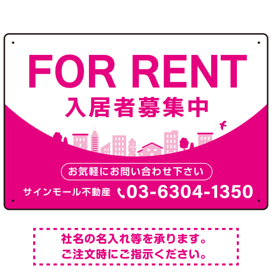 カーブが美しい明るい街並みデザイン FOR RENT 入居者募集中 不動産向けデザインプレート看板 ピンク W450×H300 エコユニボード(SP-SMD721A-45x30U)