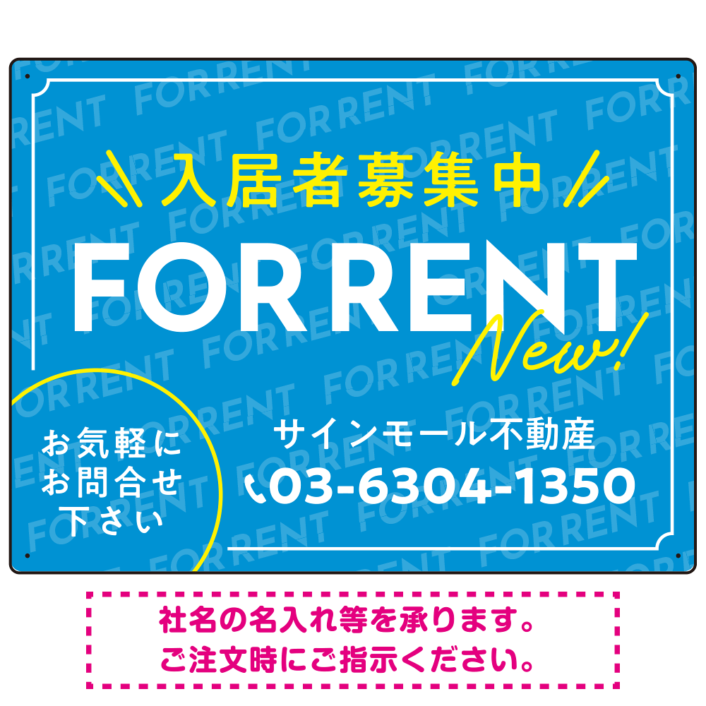 商品説明:NEWの文字がアクセントの爽やかデザイン FOR RENT 入居者募集中 不動産向けデザインプレート看板 スカイブルー W600×H450 エコユニボード(SP-SMD725A-60x45U)