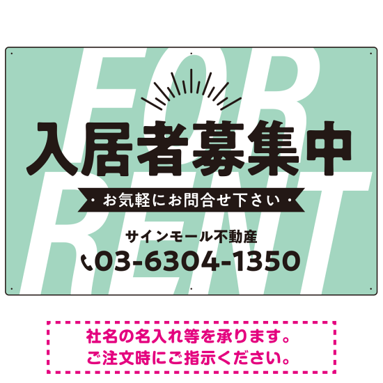 商品説明:パステルカラーと大文字の躍動感 FOR RENT 入居者募集中 不動産向けデザインプレート看板 ミントグリーン W900×H600 エコユニボード(SP-SMD727A-90x60U)