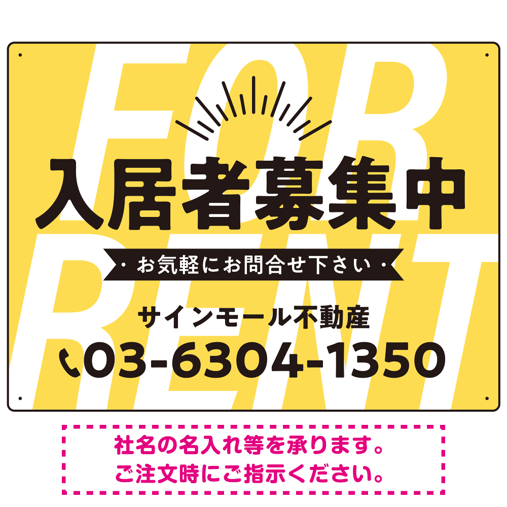 商品説明:パステルカラーと大文字の躍動感 FOR RENT 入居者募集中 不動産向けデザインプレート看板 イエロー W600×H450 エコユニボード(SP-SMD727B-60x45U)