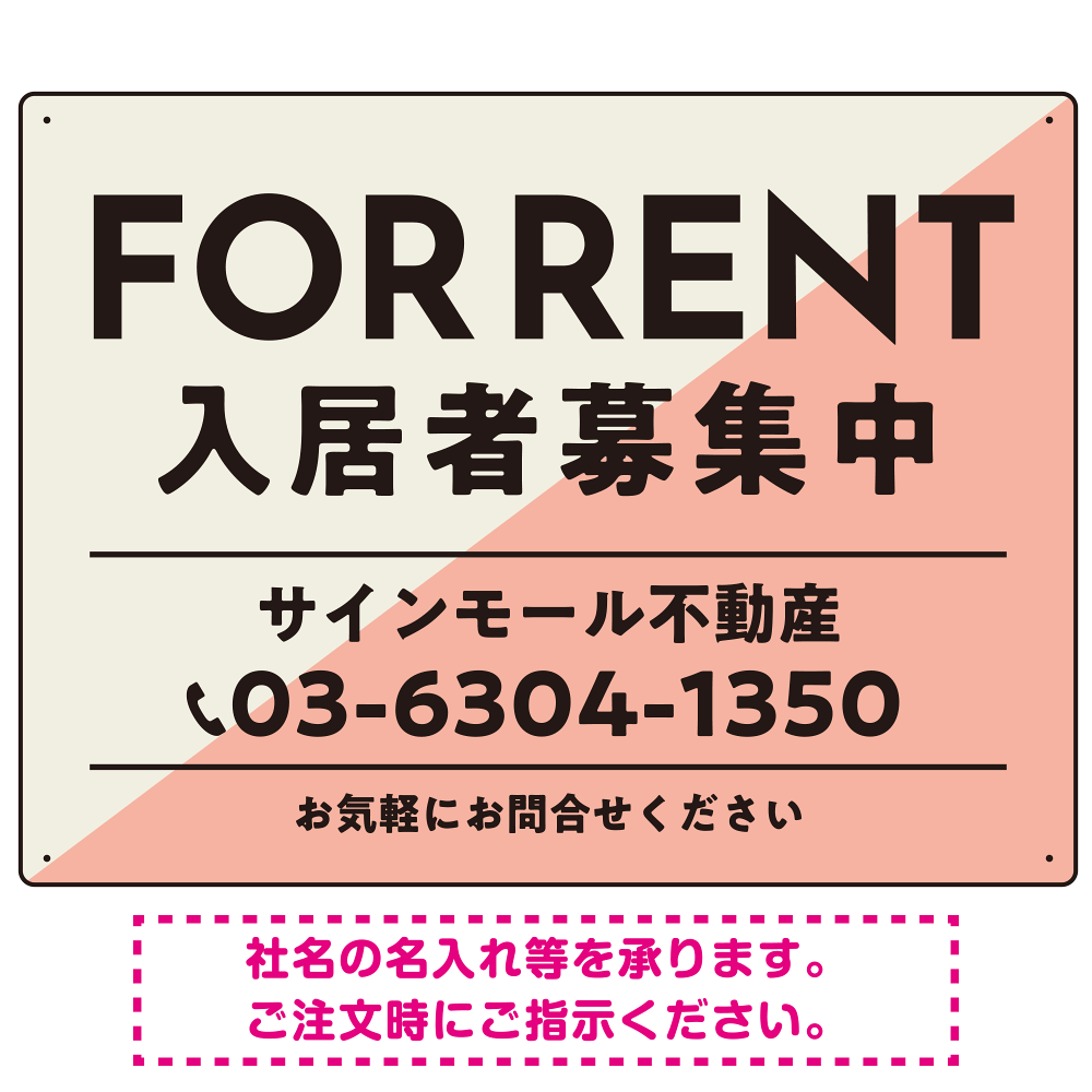 商品説明:大胆な斜めデザインが特徴的なFOR RENT 入居者募集中 不動産向けデザインプレート看板 ピンク W600×H450 アルミ複合板(SP-SMD729B-60x45A)