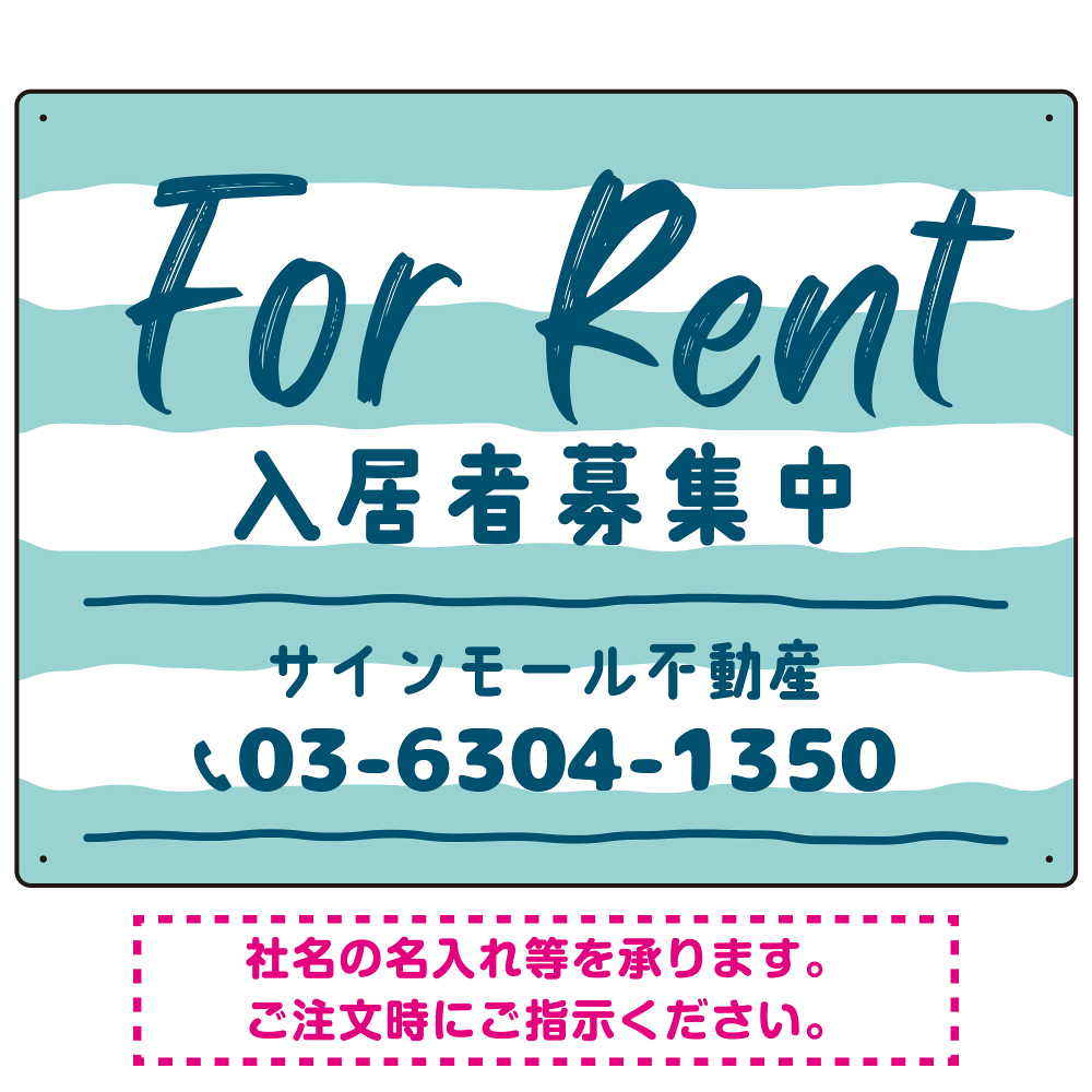 商品説明:手描き風ストライプ模様 FOR RENT 入居者募集中 不動産向けデザインプレート看板 グリーン W600×H450 エコユニボード(SP-SMD731B-60x45U)