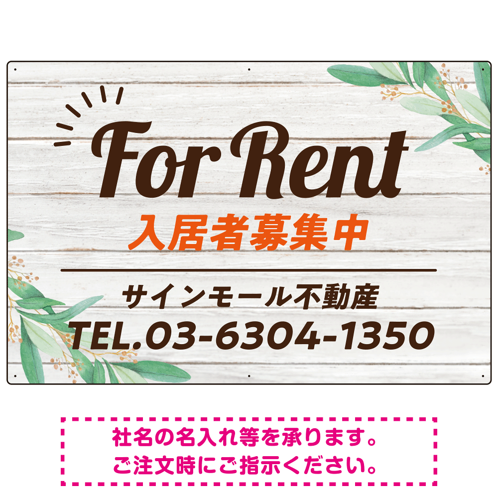 商品説明:ウッディな風合いと葉のモチーフが柔らかい 不動産向けデザインプレート看板 FOR RENT W900×H600 アルミ複合板(SP-SMD736A-90x60A)