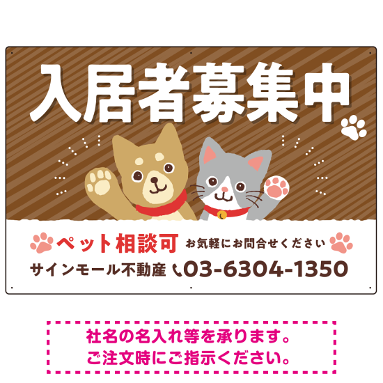 可愛らしい犬猫イラストで入居者募集中をアピールできる不動産向けプレート看板 ブラウン W900×H600 エコユニボード(SP-SMD738A-90x60U)