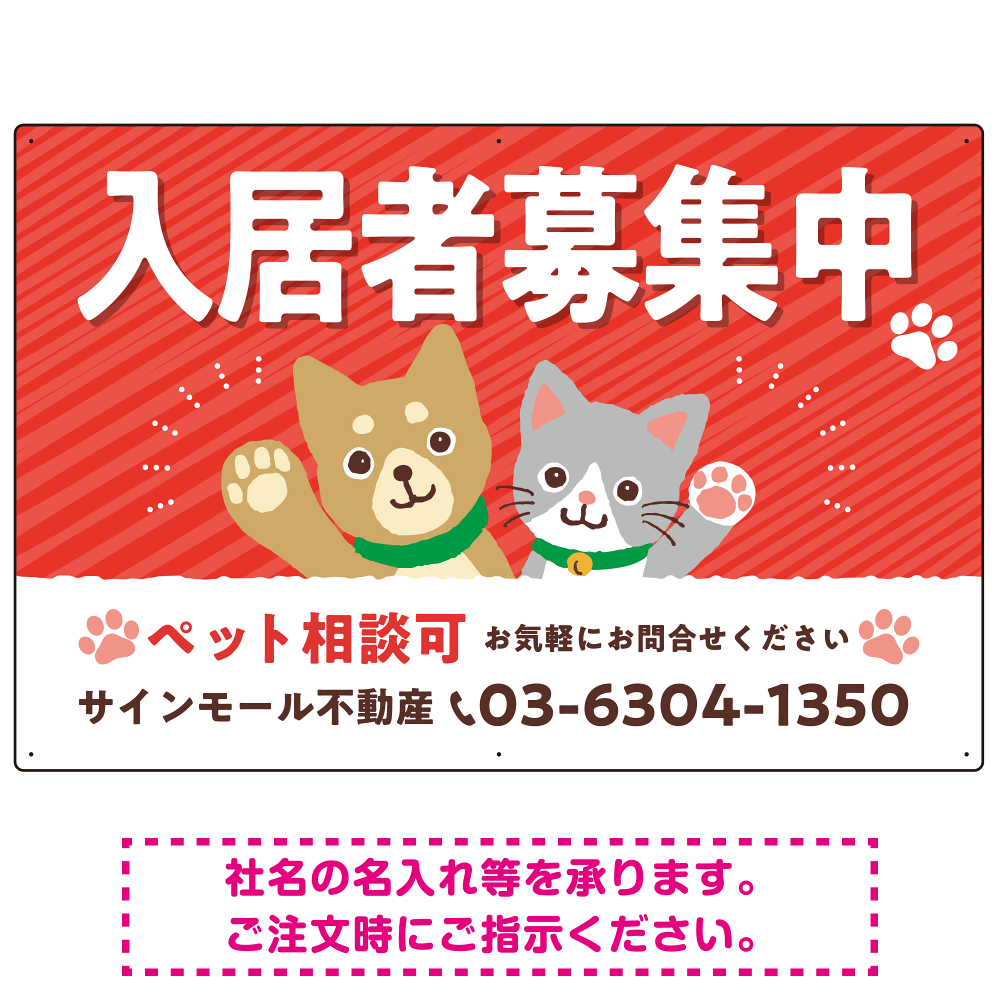 可愛らしい犬猫イラストで入居者募集中をアピールできる不動産向けプレート看板 レッド W900×H600 エコユニボード(SP-SMD738B-90x60U)