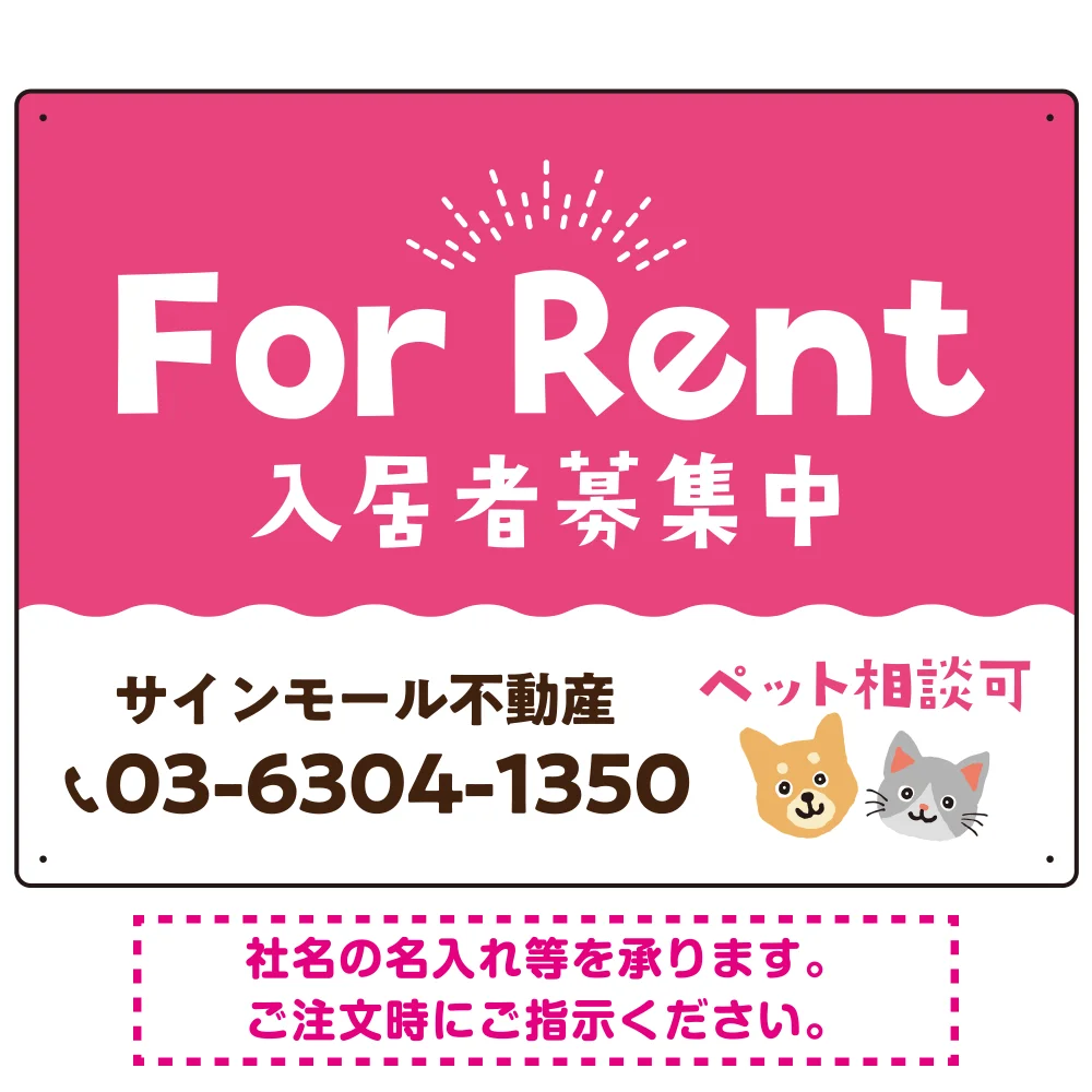 「さりげない犬猫イラストがキュートな明るい入居者募集中 不動産向けデザインプレート看板 ピンク W600×H450 エコユニボード(SP-SMD741B-60x45U)」の導入をご検討中ですか? 大量注文・複数台のご検討に応じたお見積りのご相談、最短納期や送料、仕様・サイズの確認など、 FOR RENT 入居者募集中用プレート看板選びをまとめてサポートいたします。