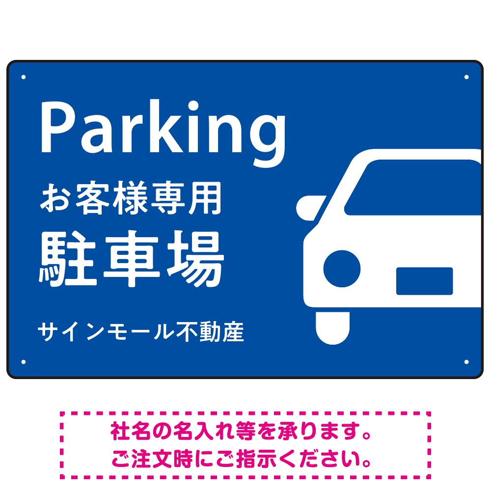 - 「Parking」「お客様専用駐車場」の文字も大きく、わかりやすく配置されています。