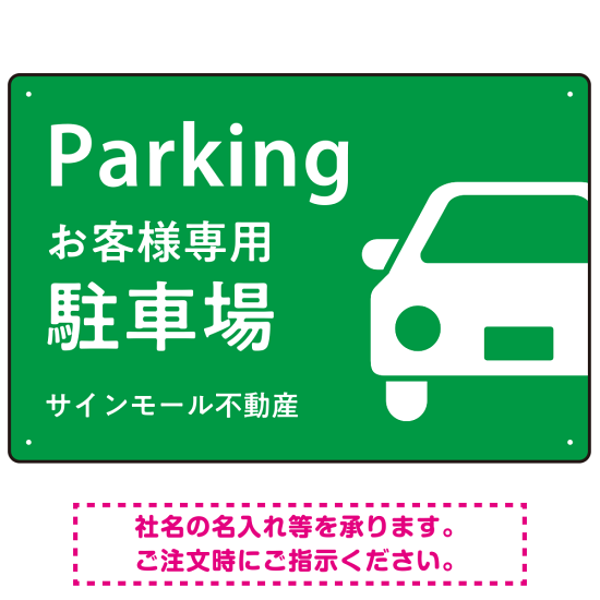- 「Parking」「お客様専用駐車場」の文字も大きく、わかりやすく配置されています。