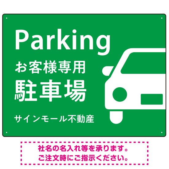 - 「Parking」「お客様専用駐車場」の文字も大きく、わかりやすく配置されています。