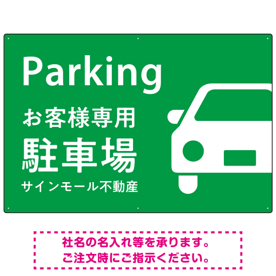 - 「Parking」「お客様専用駐車場」の文字も大きく、わかりやすく配置されています。