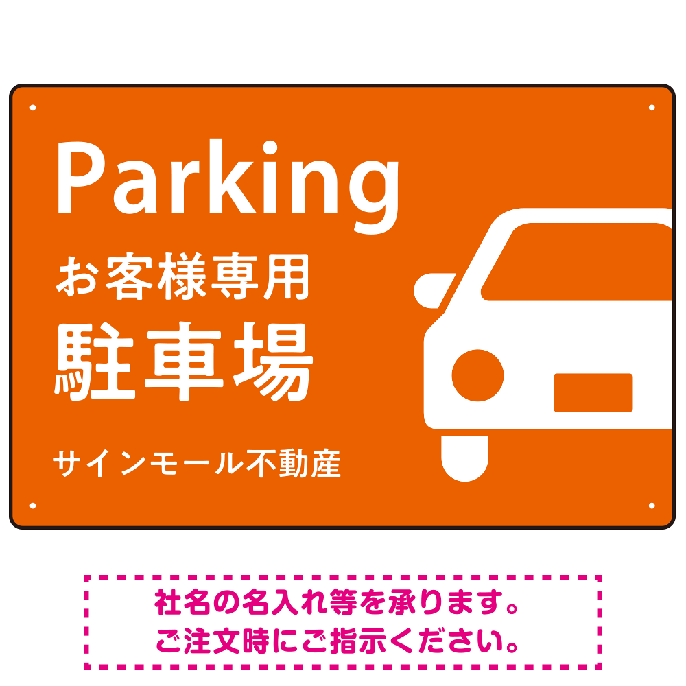 - 「Parking」「お客様専用駐車場」の文字も大きく、わかりやすく配置されています。