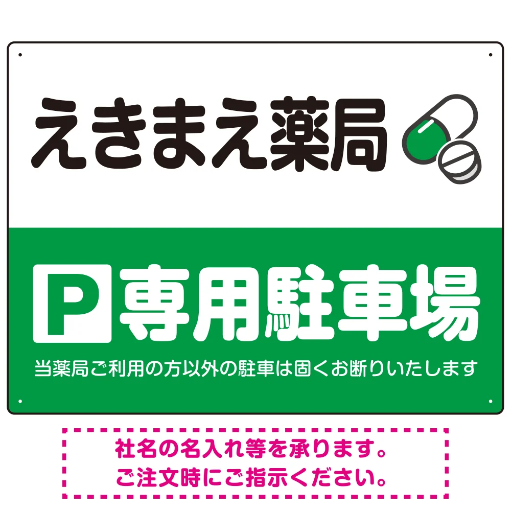 よくある質問:カラフルな薬剤モチーフが目を引くデザイン 駐車場向けデザインプレート看板 グリーン W600×H450 マグネットシート(SP-SMD767B-60x45M)