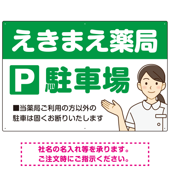 親しみやすいイラスト付きの薬局向けデザイン 駐車場向けデザインプレート看板 グリーン W900×H600 エコユニボード(SP-SMD768B-90x60U)