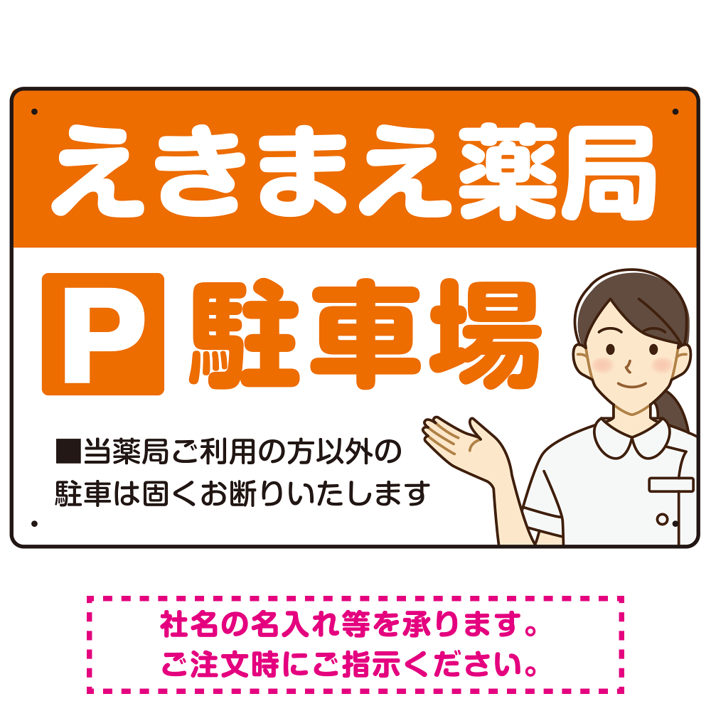 親しみやすいイラスト付きの薬局向けデザイン 駐車場向けデザインプレート看板 オレンジ W450×H300 エコユニボード(SP-SMD768C-45x30U)