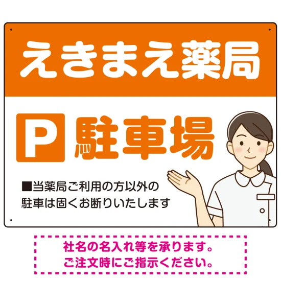 親しみやすいイラスト付きの薬局向けデザイン 駐車場向けデザインプレート看板 オレンジ W600×H450 アルミ複合板(SP-SMD768C-60x45A)