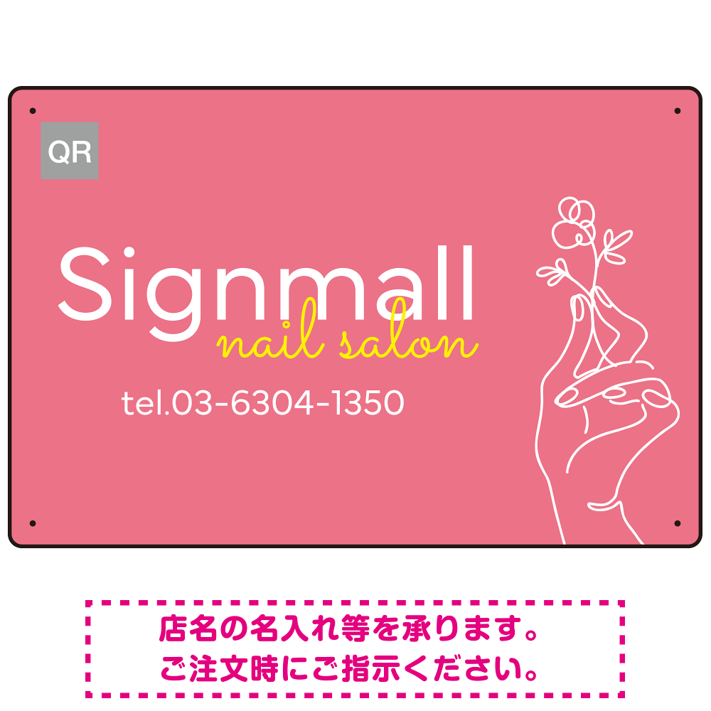 - ワンラインで描かれた手と花のイラストが印象的な、ネイルサロン向けのデザイン看板です。