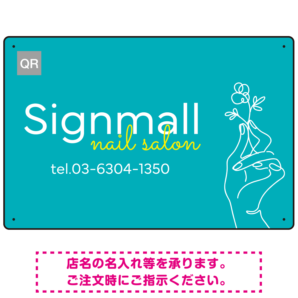 - ワンラインで描かれた手と花のイラストが印象的な、ネイルサロン向けのデザイン看板です。
