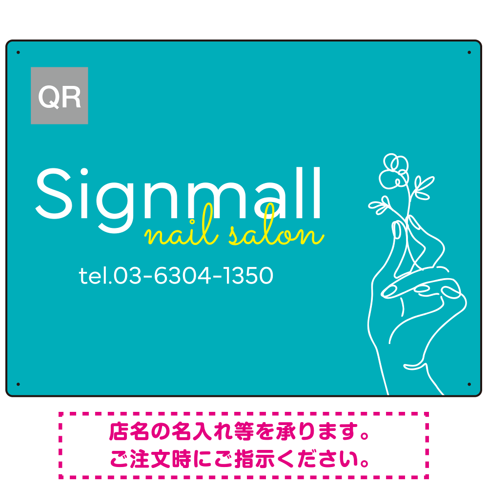 - ワンラインで描かれた手と花のイラストが印象的な、ネイルサロン向けのデザイン看板です。