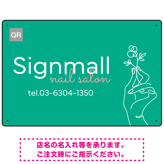 - ワンラインで描かれた手と花のイラストが印象的な、ネイルサロン向けのデザイン看板です。