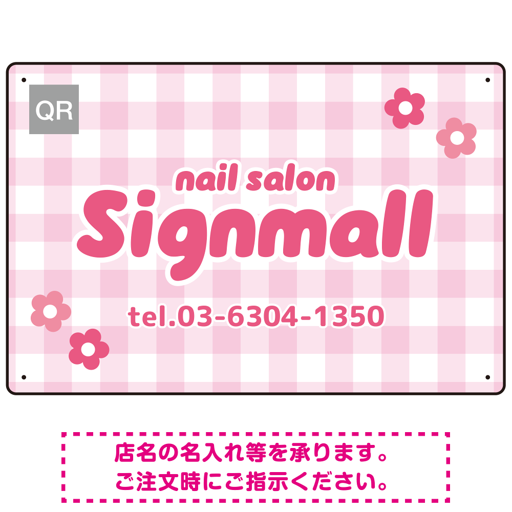 ギンガムチェックとお花モチーフのポップなネイルサロン向けデザインプレート看板 ピンク W450×H300 エコユニボード(SP-SMD784A-45x30U)