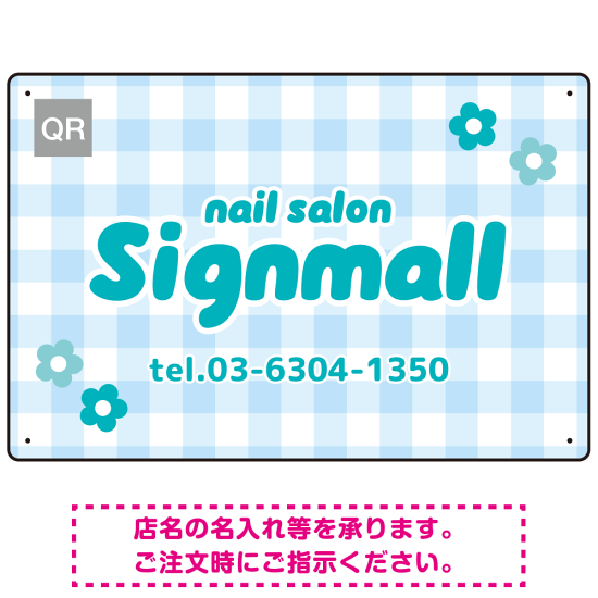 ギンガムチェックとお花モチーフのポップなネイルサロン向けデザインプレート看板 ブルー W450×H300 エコユニボード(SP-SMD784C-45x30U)