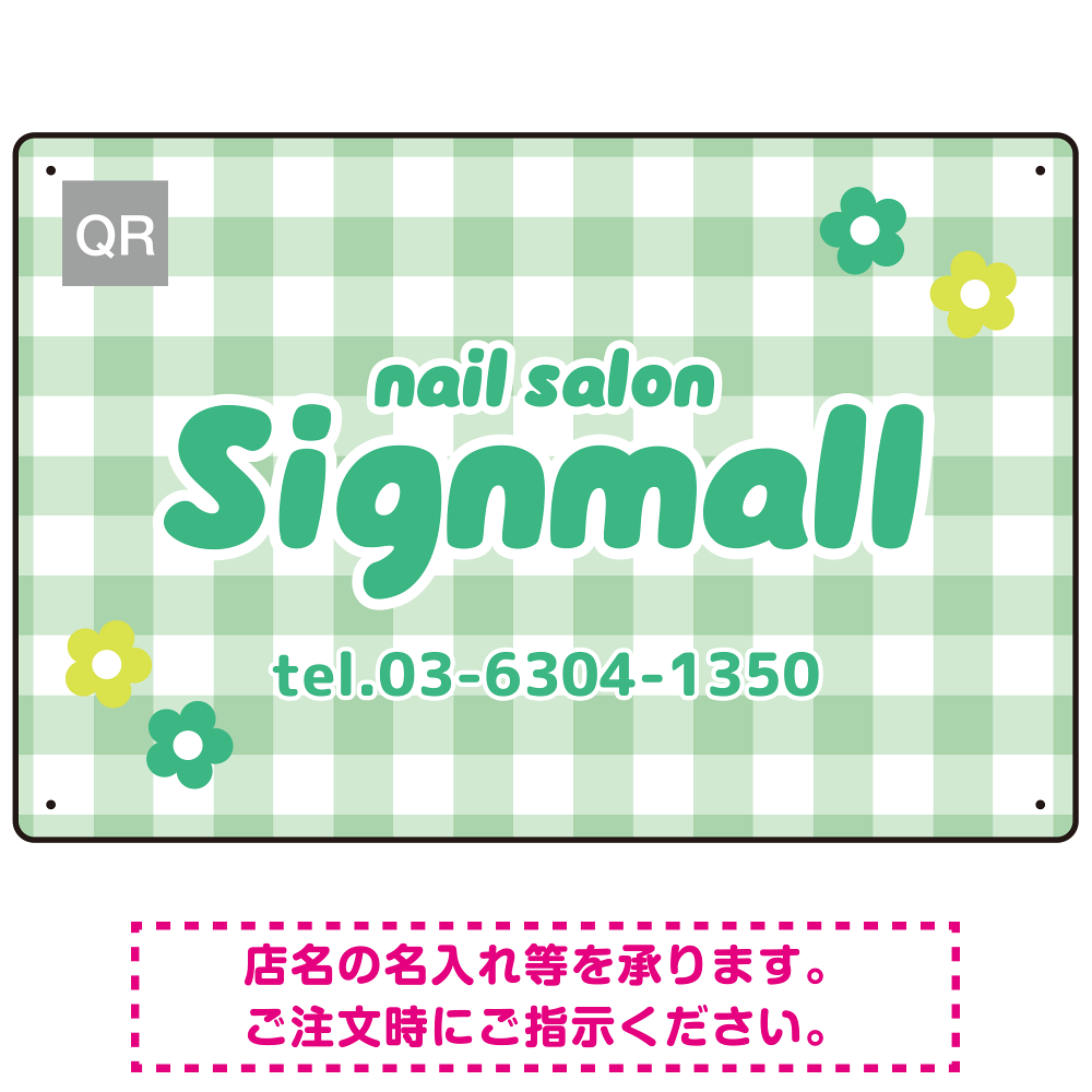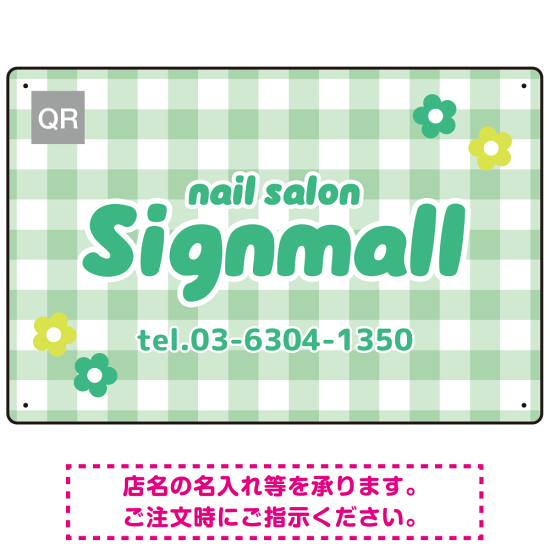 ギンガムチェックとお花モチーフのポップなネイルサロン向けデザインプレート看板 グリーン W450×H300 エコユニボード(SP-SMD784D-45x30U)