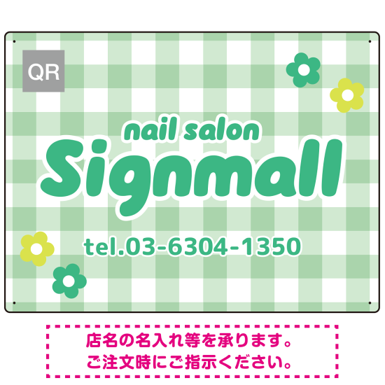 ギンガムチェックとお花モチーフのポップなネイルサロン向けデザインプレート看板 グリーン W600×H450 エコユニボード(SP-SMD784D-60x45U)
