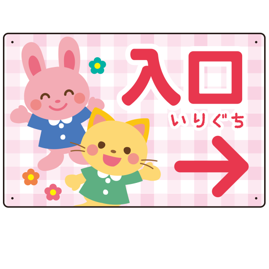 - やさしいチェック柄が親しみやすい印象を与え、ふりがなの「いりぐち」表記が小さなお子さまにもわかりやすいデザインとなっています。