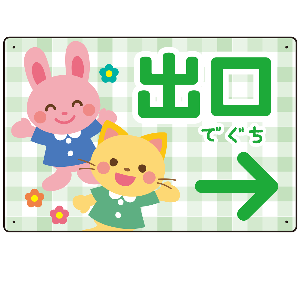- やさしいチェック柄が親しみやすい印象を与え、ふりがなの「でぐち」表記が小さなお子さまにもわかりやすいデザインとなっています。
