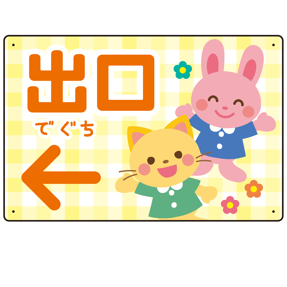 - やさしいチェック柄が親しみやすい印象を与え、ふりがなの「でぐち」表記が小さなお子さまにもわかりやすいデザインとなっています。