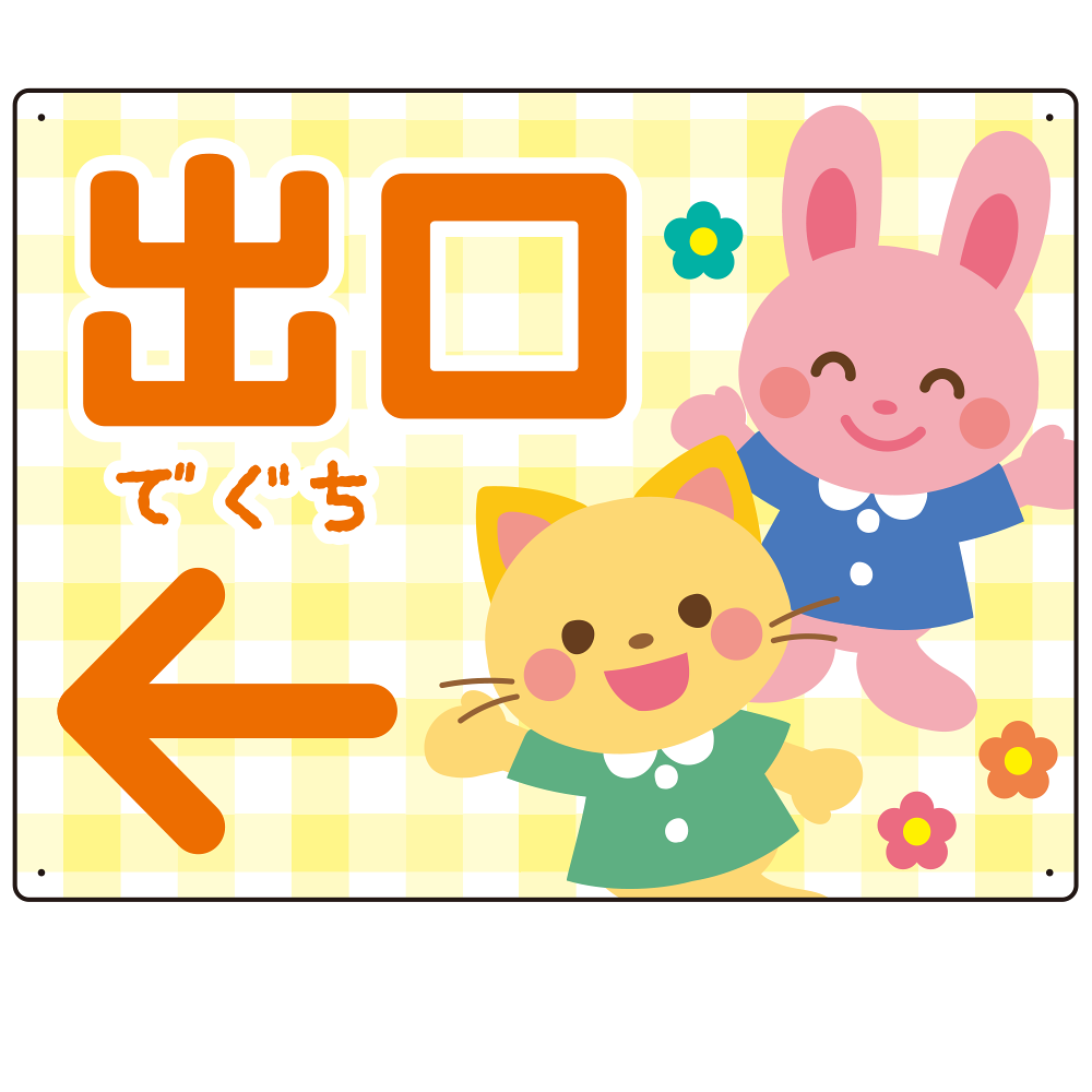 - やさしいチェック柄が親しみやすい印象を与え、ふりがなの「でぐち」表記が小さなお子さまにもわかりやすいデザインとなっています。