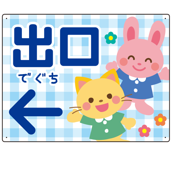 - やさしいチェック柄が親しみやすい印象を与え、ふりがなの「でぐち」表記が小さなお子さまにもわかりやすいデザインとなっています。