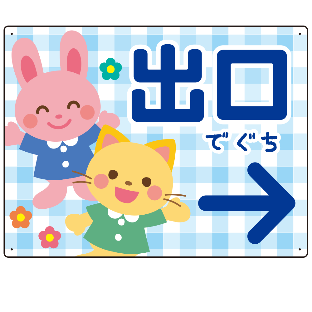 - やさしいチェック柄が親しみやすい印象を与え、ふりがなの「でぐち」表記が小さなお子さまにもわかりやすいデザインとなっています。