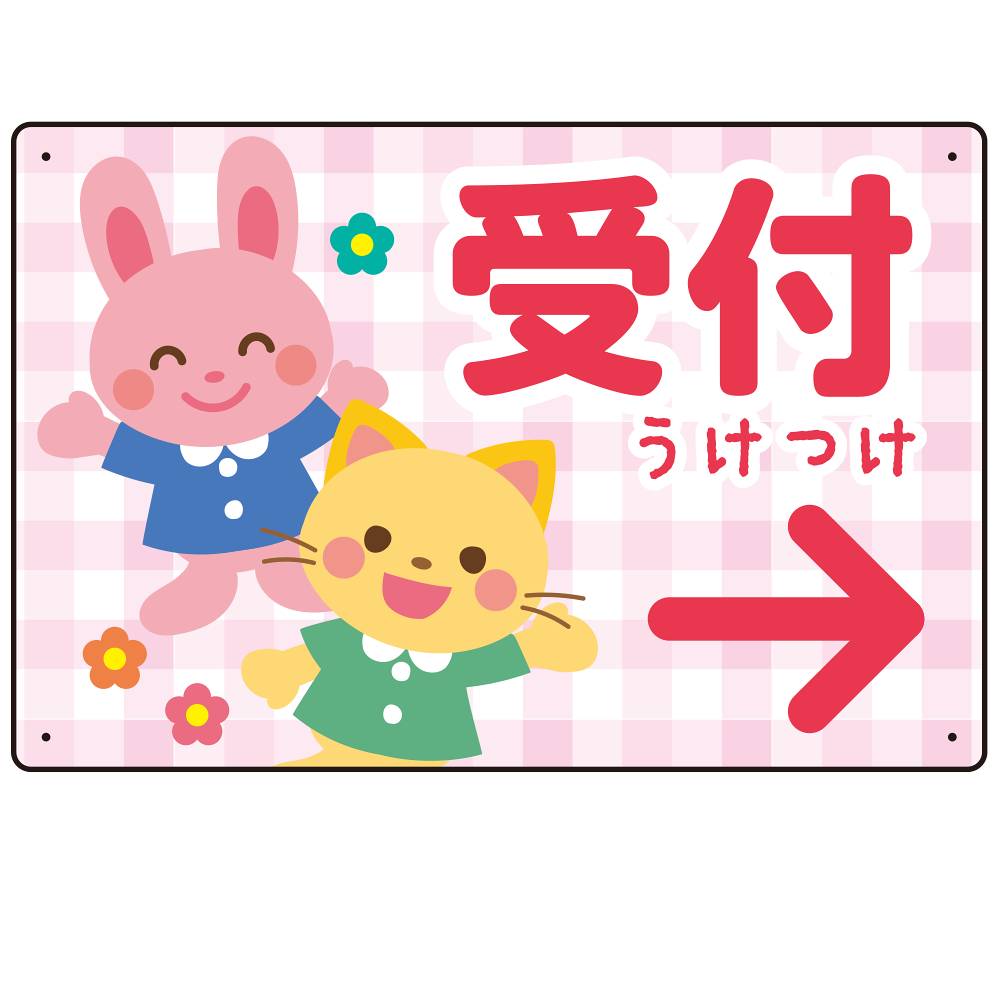 - やさしいチェック柄が親しみやすい印象を与え、ふりがなの「うけつけ」表記が小さなお子さまにもわかりやすいデザインとなっています。