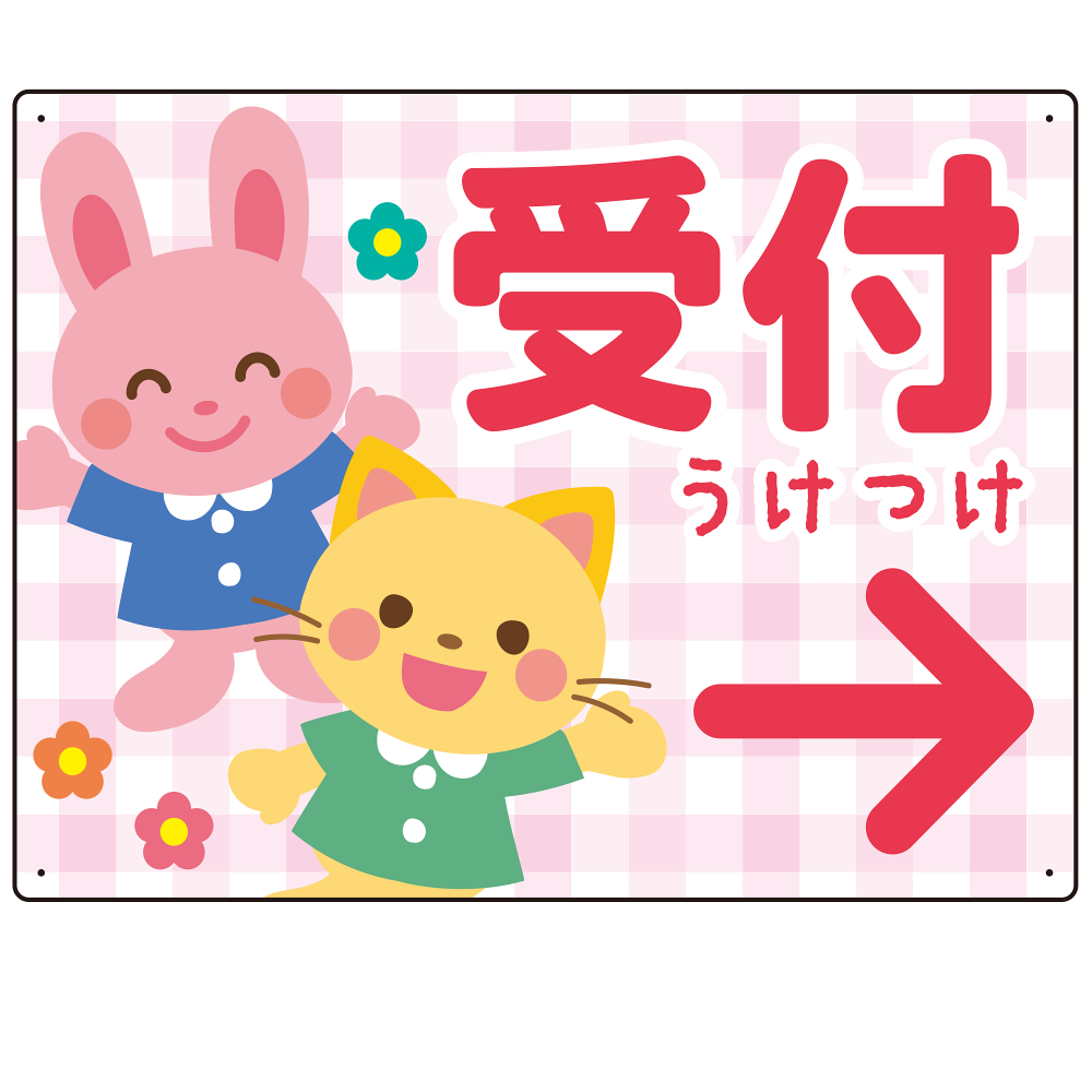 - やさしいチェック柄が親しみやすい印象を与え、ふりがなの「うけつけ」表記が小さなお子さまにもわかりやすいデザインとなっています。