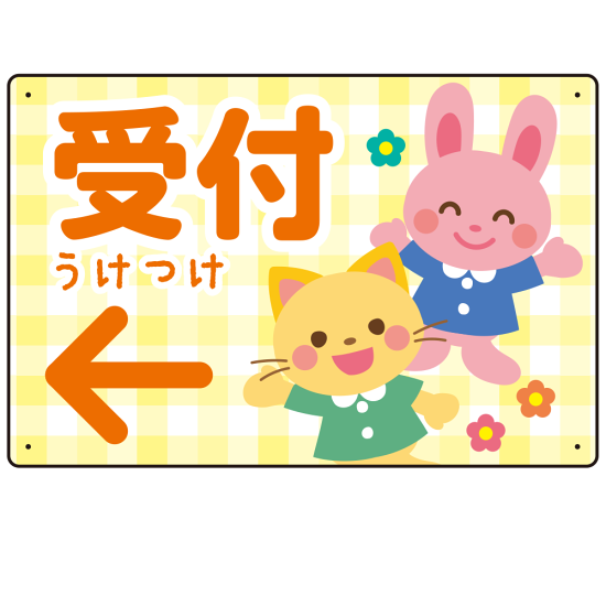 - やさしいチェック柄が親しみやすい印象を与え、ふりがなの「うけつけ」表記が小さなお子さまにもわかりやすいデザインとなっています。